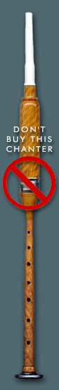 Buying A Quality Practice Chanter Many beginning bagpipe students (or their parents and/or relatives) are so excited at the idea of learning bagpipes that they rush out and buy the first (or least expensive) practice chanter that they find. They may buy it from a local music shop, an online auction, a booth at the highland games, or even from a reputable Scottish importer or piping supply shop. The chanter pictured to the right is a typical example of many people's first chanter. I had one once. In fact I think I still have it, although somewhere along the line it got broken in half. I can't quite remember how. Maybe I just got too frustrated with it and broke it over my knee. Chanters such as these are often made in Pakistan (current politics aside) and are generally of very poor quality. They may look attractive, with their shiny bits of metal and high-gloss finish, but they are trouble! Take a close look at the chanter pictured to the right. You may already have one of these in your possession. If you do, consider it a lesson learned and then go out and purchase a quality instrument. The purpose of this article is not to make anyone feel bad for buying a cheap practice chanter - but to explain the problems of learning on a practice chanter such as this, and how to instead choose a high-quality instrument that will give you years of playing enjoyment. Attempting to learn or play music on an instrument of poor quality is a dead-end. Any instrumentalist will agree that when you play on a quality instrument, life is great. When you play on a bad instrument, life can seem very hard indeed. (Life = playing good music) Why is learning on a low-quality practice chanter detrimental to your playing?